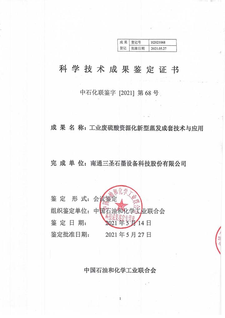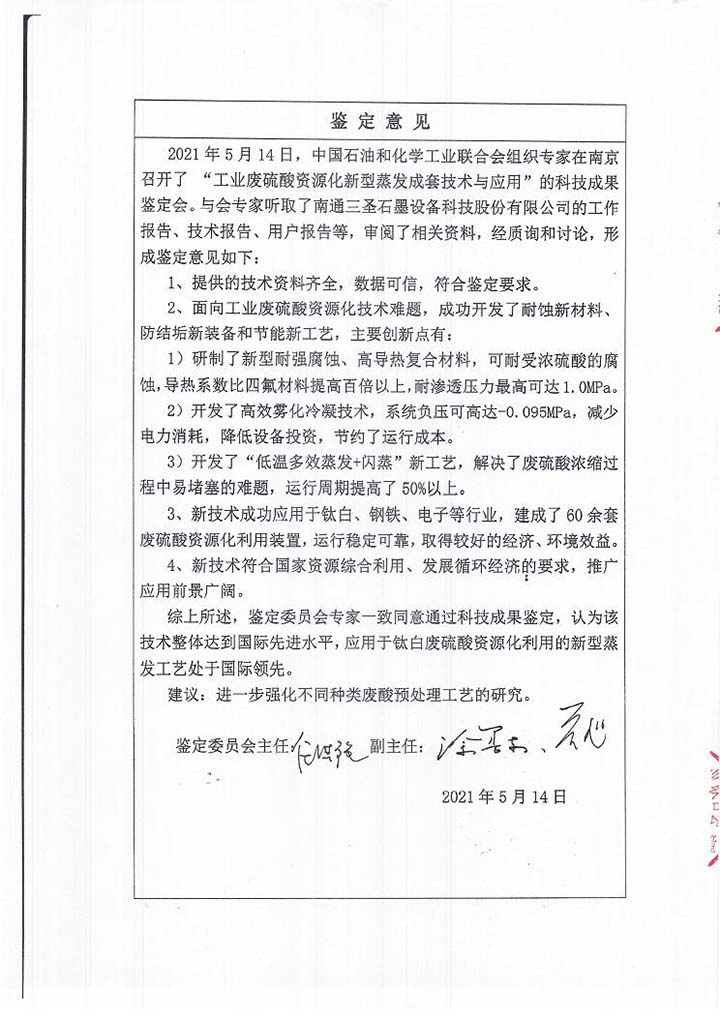 2021年5月27日,中國石油和化學工業(yè)聯(lián)合會批準了南通三圣石墨設備科技股份有限公司“工業(yè)廢硫酸資源化新型蒸發(fā)成套技術(shù)與應用”的科技成果鑒定,由南京大學任洪強院士擔任主任,華東理工大學涂善東院士、南京工業(yè)大學喬旭校長擔任副主任的鑒定委員會專家一致認為,該技術(shù)整體達到國際先進水平,應用于鈦白廢硫酸資源化利用的新型蒸發(fā)工藝處于國際領先。