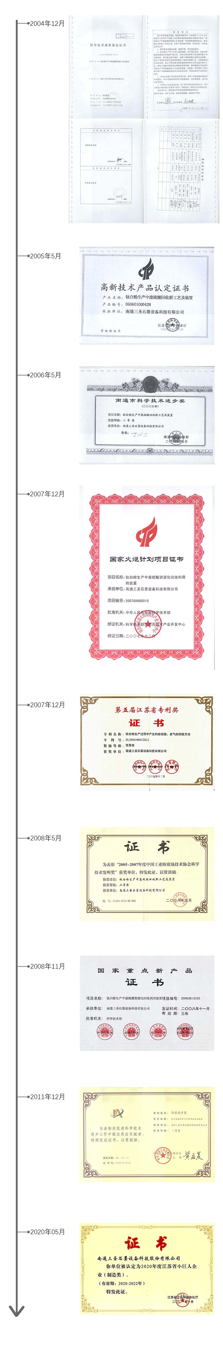 南通三圣該項技術(shù)先后得到了政府諸多部門的高度評價。2004年12月,“鈦白粉生產(chǎn)中廢硫酸回收新工藝及裝置”通過江蘇省科技廳組織的科技成果鑒定,鑒定意見指出,該項成果填補了國內(nèi)鈦白粉產(chǎn)業(yè)廢硫酸回收技術(shù)及裝備的空白,總體水平達到國際先進。2005年5月,該項成果被認定為江蘇省高新技術(shù)產(chǎn)品。2006年5月,該項成果榮獲南通市科技進步二等獎。2007年12月,“鈦白粉生產(chǎn)中廢硫酸資源化回收利用的裝置”被科技部列為國家火炬計劃項目。2007年12月,“鈦白粉生產(chǎn)過程中產(chǎn)生的廢硫酸、廢氣的回收方法”榮獲江蘇省優(yōu)秀專利獎。2008年5月,“鈦白粉生產(chǎn)中廢硫酸回收新工藝及裝置”榮獲中國工業(yè)防腐蝕技術(shù)協(xié)會技術(shù)發(fā)明二等獎。2008年11月,“鈦白粉生產(chǎn)中廢硫酸資源化回收利用裝置”被科技部、環(huán)保部、商務部、國家質(zhì)檢總局認定為國家重點新產(chǎn)品。2011年12月,“鈦白廢酸資源化節(jié)能回收系統(tǒng)裝置”榮獲中華全國工商業(yè)聯(lián)合會科技進步二等獎。2020年,公司以工業(yè)廢副硫酸低能耗蒸發(fā)濃縮與資源化回收成套裝備產(chǎn)品獲得江蘇省專精特新小巨人企業(yè)榮譽稱號。