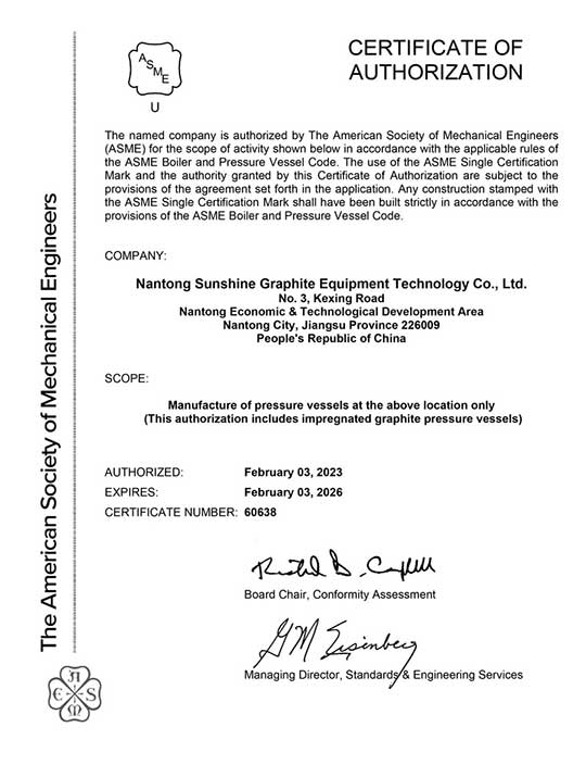 獲得ASME “U”鋼印認(rèn)證標(biāo)志著南通三圣在石墨設(shè)備制造方面的實力得到了國際權(quán)威的認(rèn)可。這不僅體現(xiàn)了公司在研發(fā)、生產(chǎn)和質(zhì)量控制方面的優(yōu)秀表現(xiàn),也是對公司持續(xù)創(chuàng)新和環(huán)保理念的有力證明。