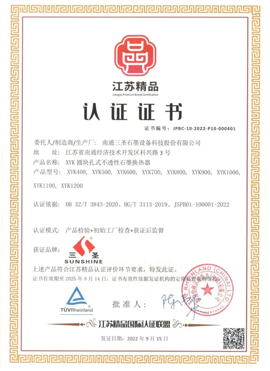 經(jīng)“江蘇精品”國際認(rèn)證聯(lián)盟認(rèn)證,南通三圣石墨設(shè)備科技股份有限公司榮膺“ 江蘇精品 ”認(rèn)證 ,成功躋身“江蘇精品”優(yōu)質(zhì)制造業(yè)品牌。