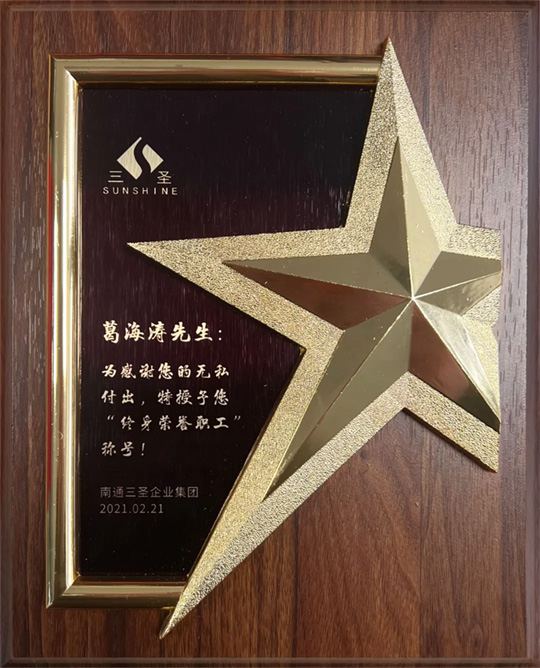 三圣奮斗史中閃耀著這樣一顆璀璨之星,他以堅(jiān)定的信念和不懈的努力,登上榮譽(yù)巔峰,成為開發(fā)區(qū)當(dāng)之無愧的一名“金牌員工”,并被三圣集團(tuán)董事會(huì)、三圣工會(huì)授予“終身榮譽(yù)職工”的光榮稱號(hào)。