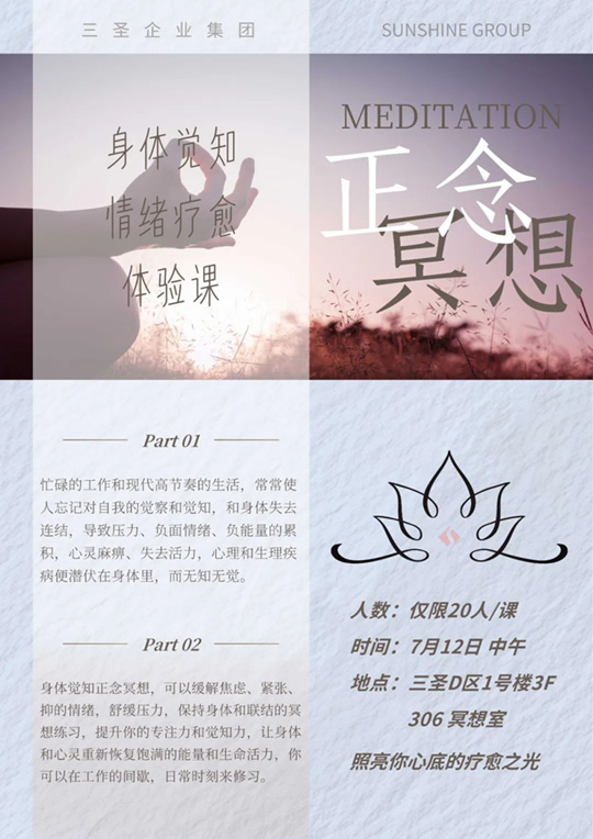 三圣集團(tuán)最新開設(shè)的冥想課程,旨在幫助職工通過冥想達(dá)到內(nèi)心的寧靜與平和,提升個(gè)人的情緒管理、專注力和生活質(zhì)量。隨著今天第一堂體驗(yàn)課的啟動(dòng),之后每周都有免費(fèi)的公益課程可報(bào)名參加。這一全新形式的開放課程,升華了三圣企業(yè)文化的精神內(nèi)涵。