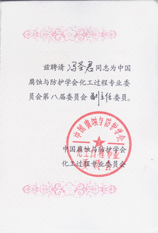 鑒于馮圣君在中國腐蝕與防護領(lǐng)域的杰出貢獻與不懈追求,中國腐蝕與防護學會經(jīng)過認真考察,決定聘任其擔任化工過程專業(yè)委員會副主任,代表企業(yè)界參與學會工作。