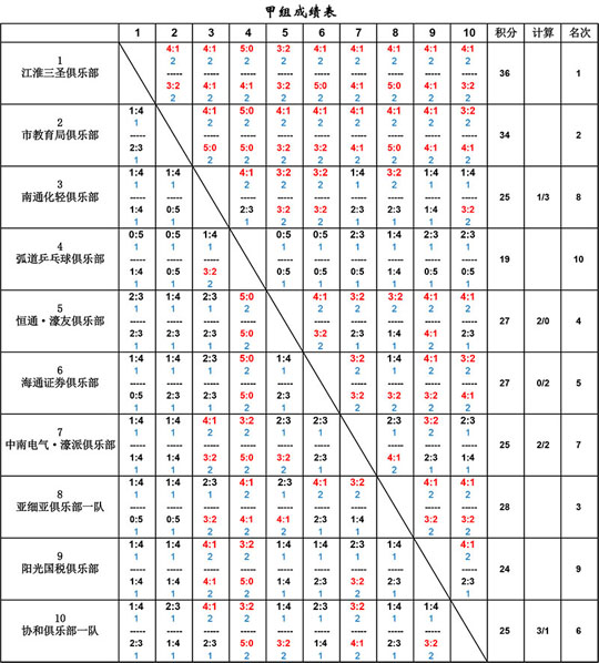 甲組:1、江淮三圣乒乓球俱樂部2、市教育局乒乓球俱樂部3、亞細亞乒乓球俱樂部一隊4、恒通·濠友乒乓球俱樂部5、海通證券乒乓球俱樂部6、協(xié)和乒乓球俱樂部一隊7、中南電氣·濠派乒乓球俱樂部8、南通化輕乒乓球俱樂部9、陽光國稅乒乓球俱樂部10、弧道乒乓球俱樂部