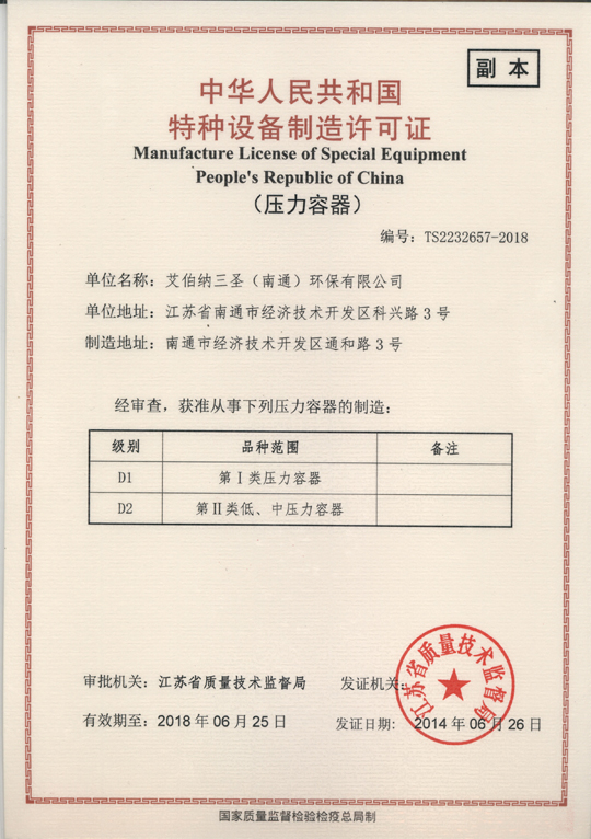 日前,艾伯納三圣(南通)環(huán)保有限公司順利取得了由江蘇省質(zhì)量技術(shù)監(jiān)督局頒發(fā)的《中華人民共和國(guó)特種設(shè)備制造許可證》。獲準(zhǔn)從事D1(第Ⅰ類壓力容器)、D2(第Ⅱ類低、中壓力容器)的制造,標(biāo)志著艾伯納三圣壓力容器生產(chǎn)的正式開(kāi)始。