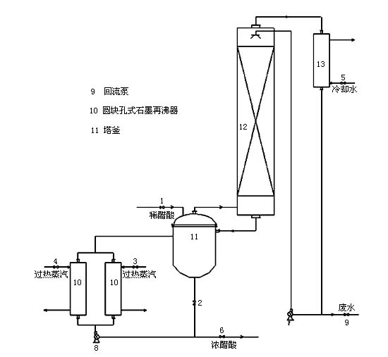 本系統(tǒng)采用先進(jìn)設(shè)計(jì)理念,將生產(chǎn)過程產(chǎn)生的15%-25%的稀醋酸濃縮到99%,在此過程中使排放的廢水達(dá)到環(huán)保標(biāo)準(zhǔn)。系統(tǒng)主體設(shè)備-石墨精餾塔,采用聚四氟乙烯浸漬石墨新型材料制造,整個(gè)系統(tǒng)具有工藝先進(jìn),操作簡(jiǎn)便,運(yùn)行費(fèi)用少,使用年限長的特點(diǎn),目前,該系統(tǒng)已在浙江龍盛集團(tuán)、浙江閏土集團(tuán)成功運(yùn)行。